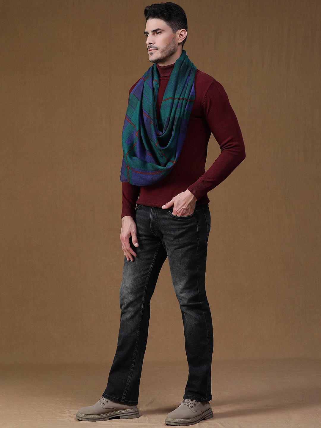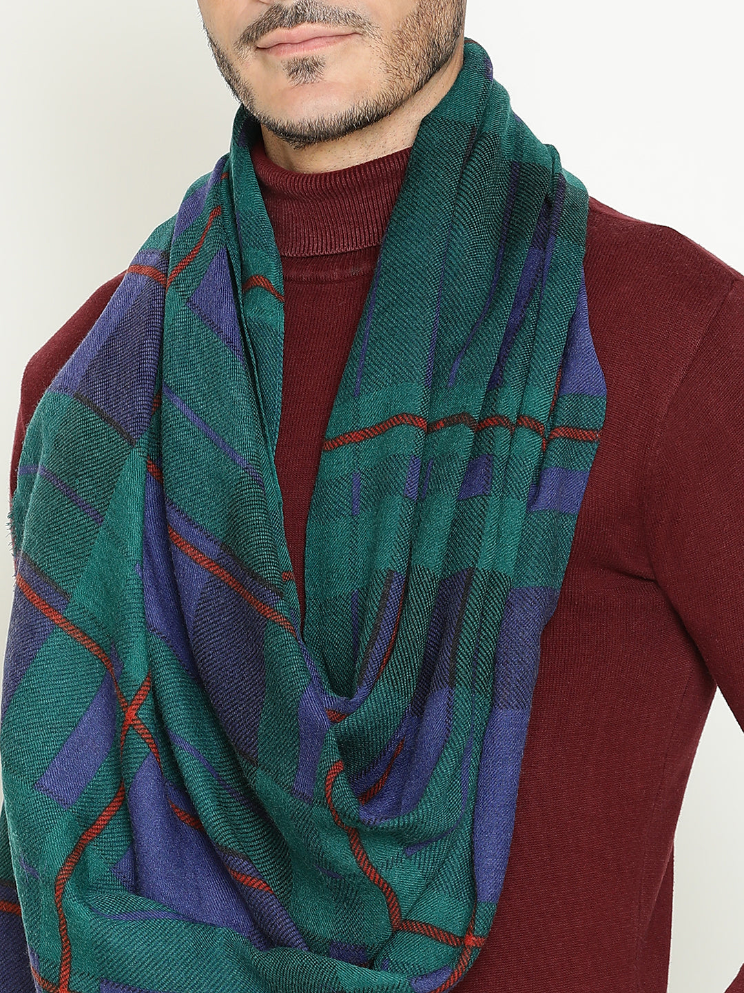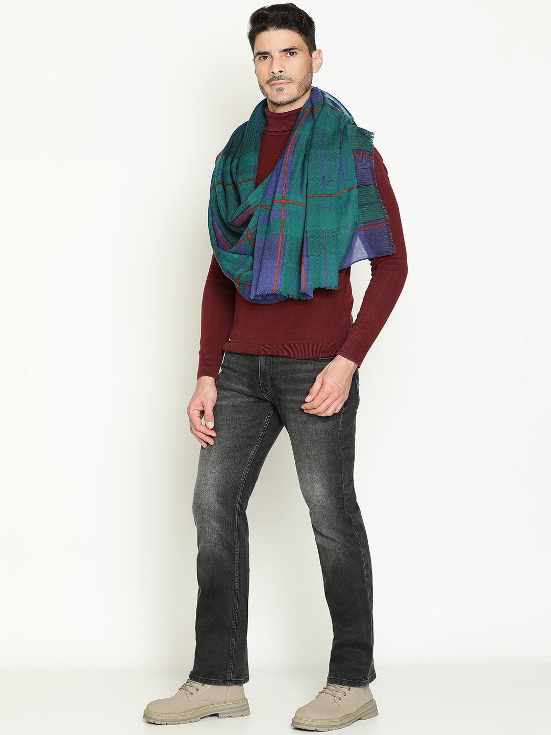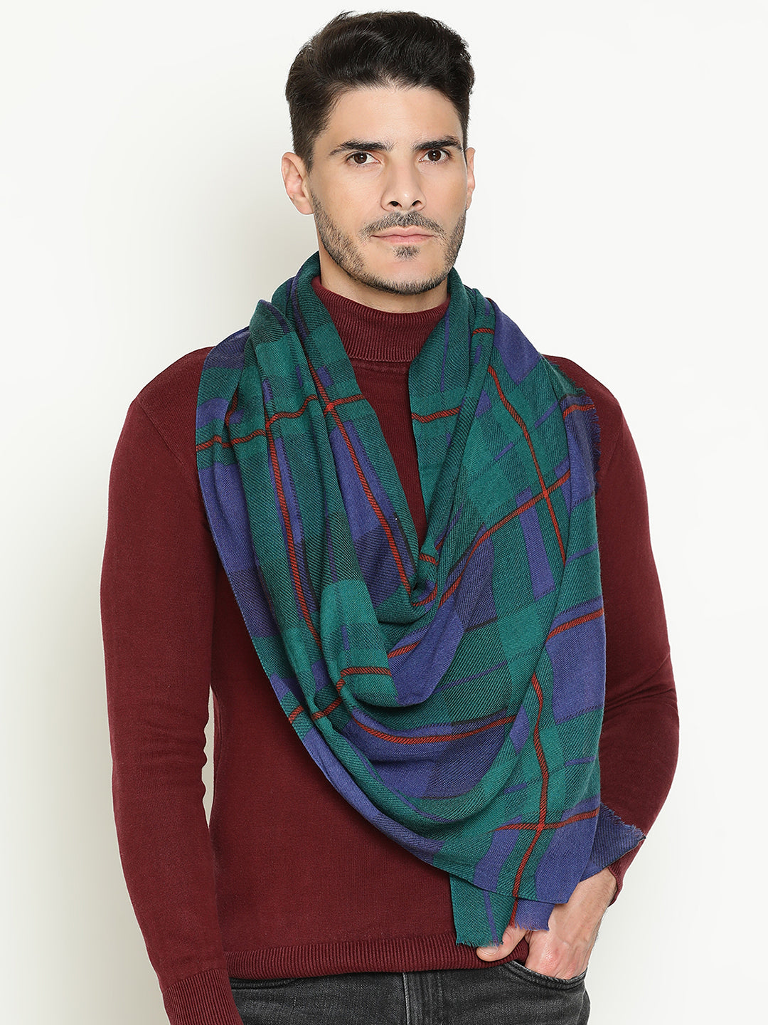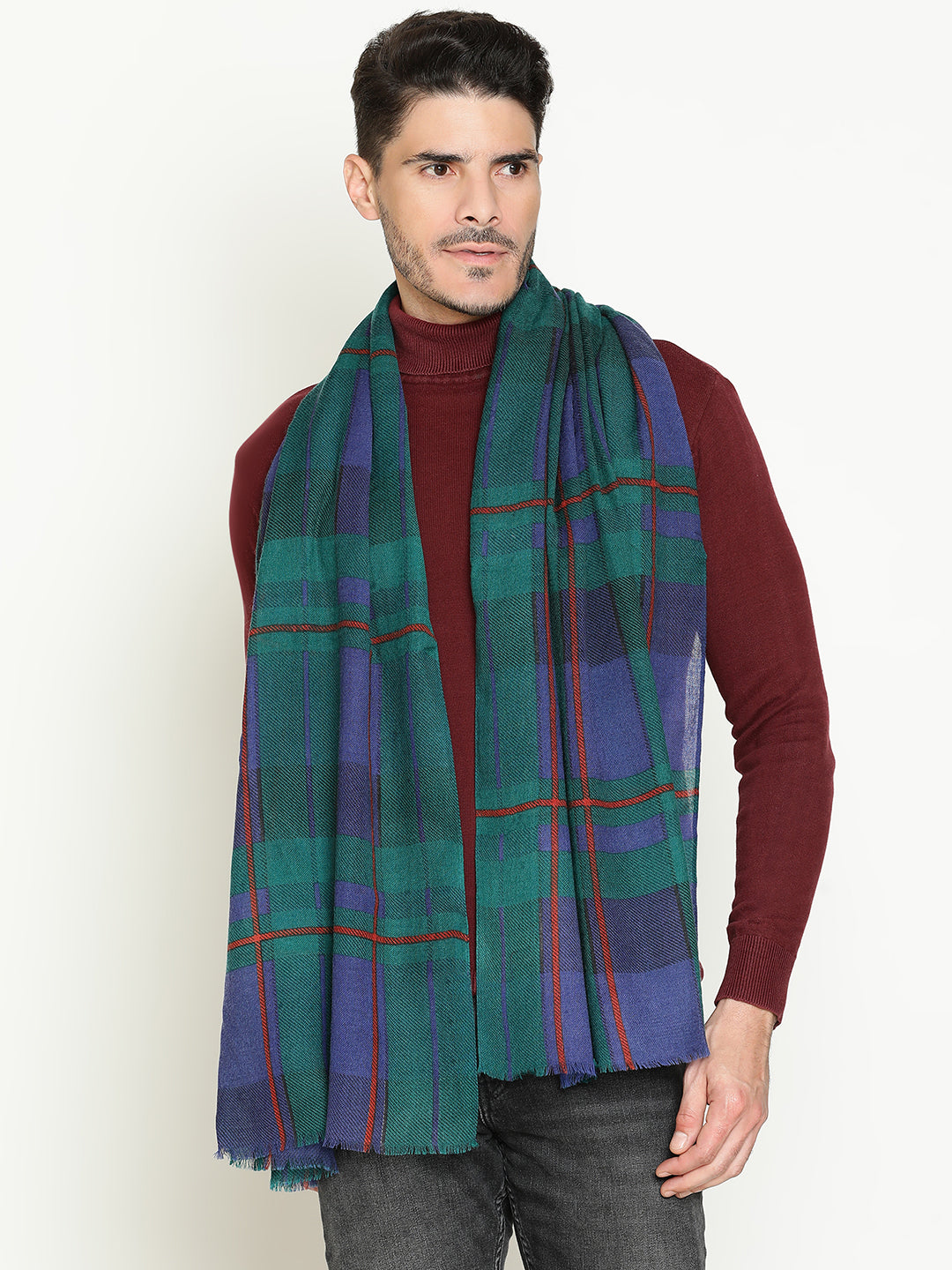 Classic meets contemporary in this men’s pure wool scarf featuring a timeless tartan print in deep navy and green tones. Crafted from 100% pure wool, it offers natural warmth, breathability, and a soft, comfortable feel against the skin. The bold check pattern adds character without overpowering, making it perfect for both casual and dressed-up looks. Lightweight yet insulating, this scarf is ideal for layering through cooler months — a versatile piece that adds texture, color, and polish to your everyday wardrobe.
