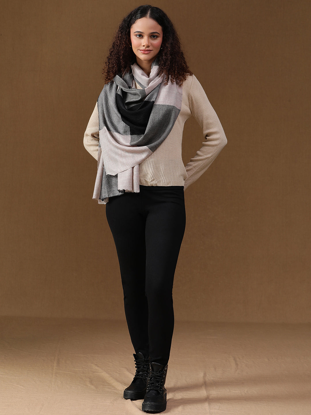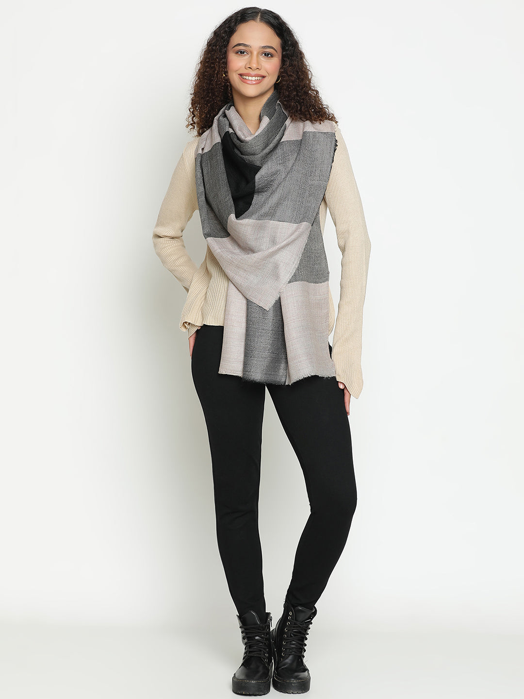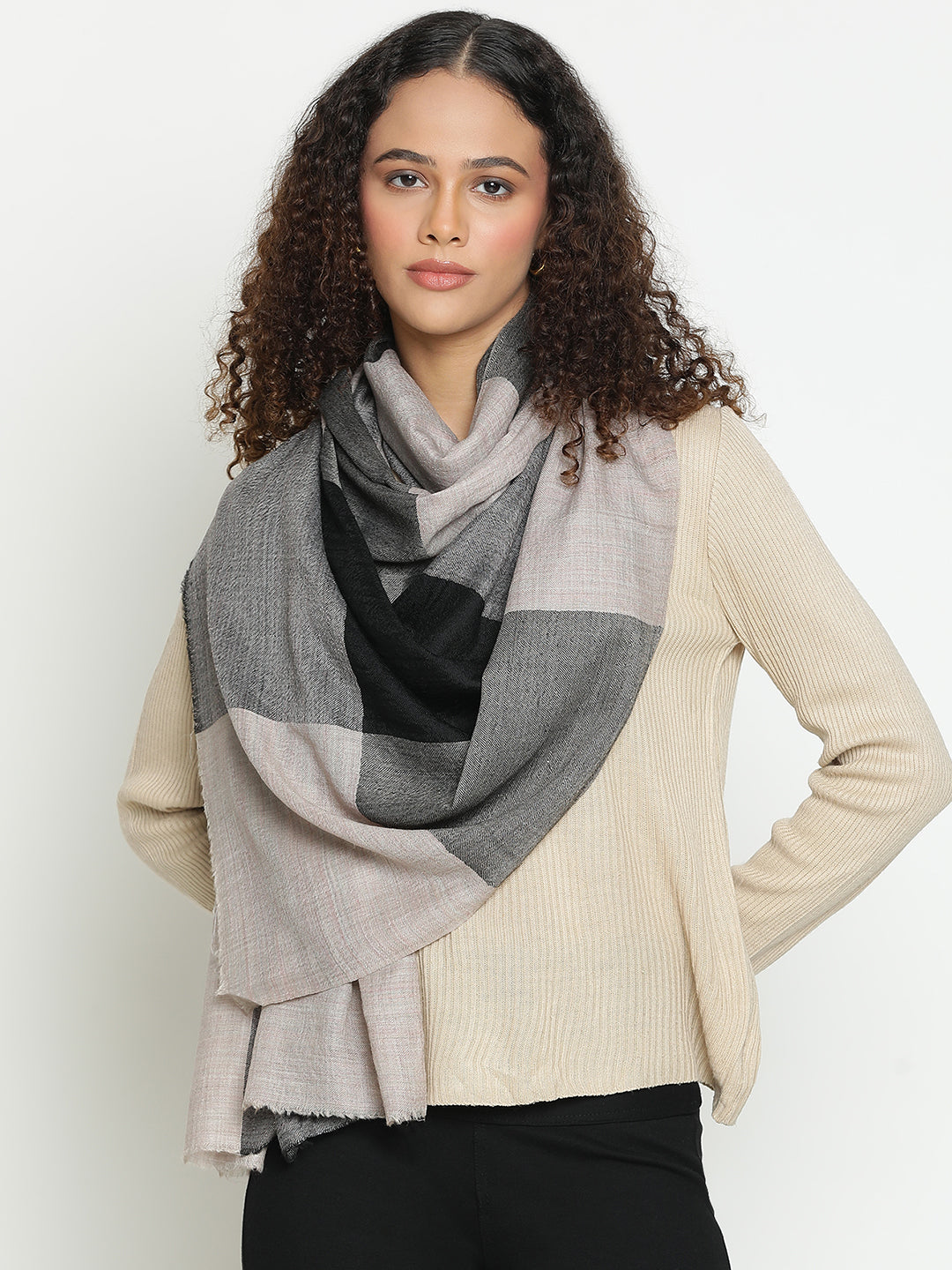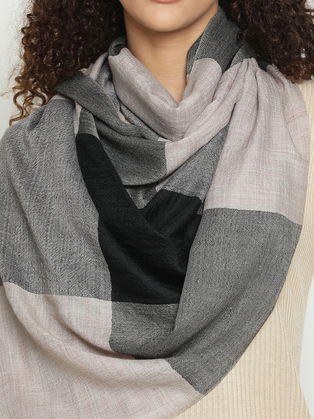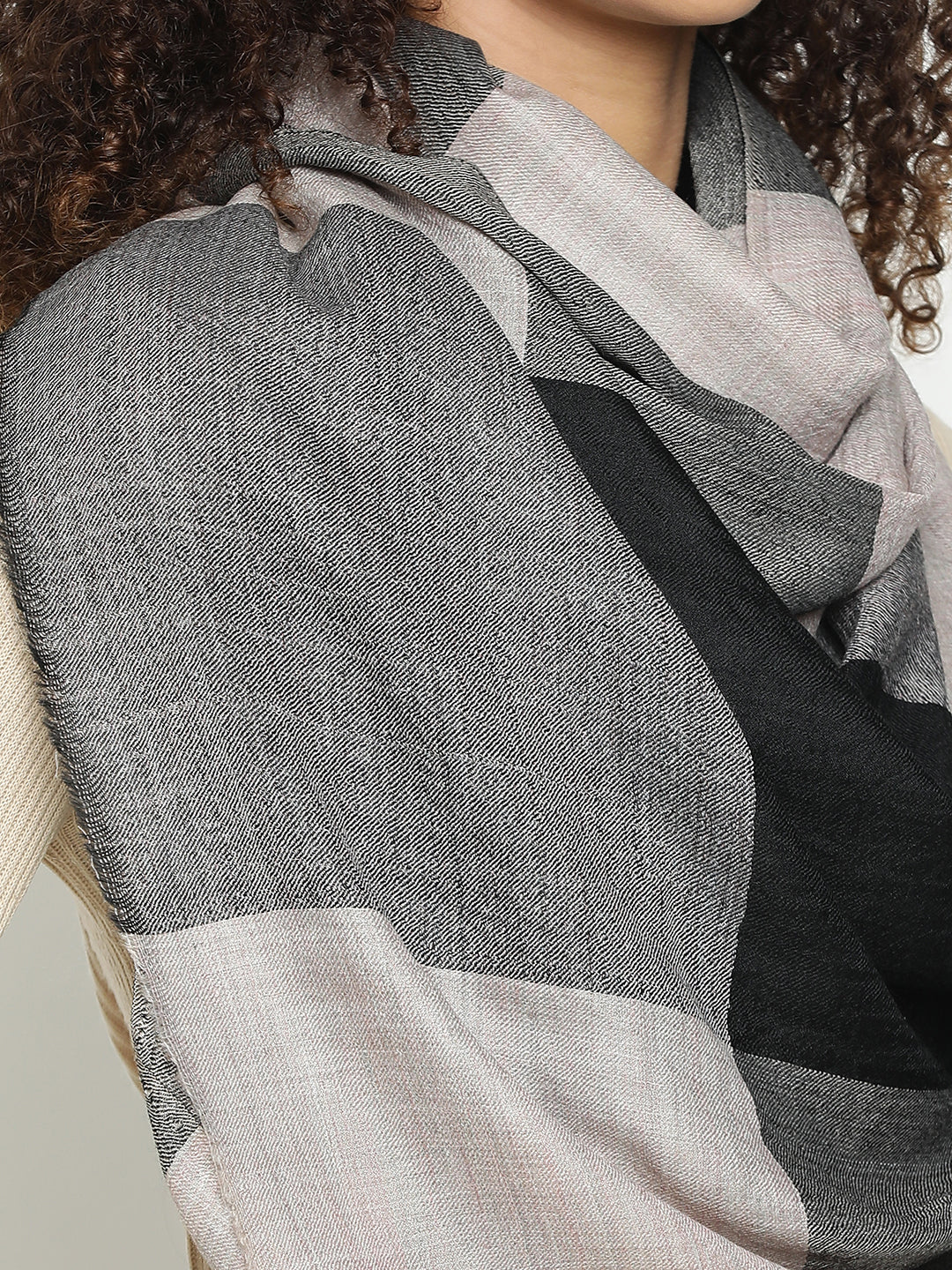 Neutral Grey Wool & Cashmere Checked Winter Stole
